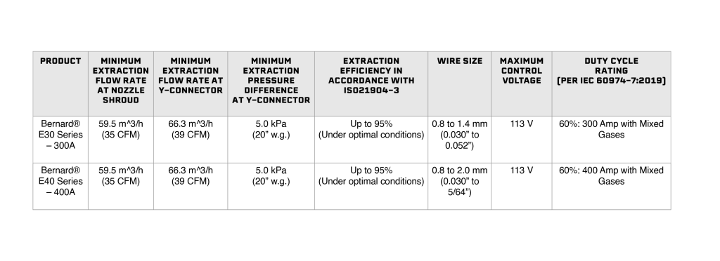 Bernard® Clean Air E™ fume extraction MIG guns captures welding fumes at the source, helping users maintain a compliant and a cleaner welding environment. Built with a robust, ergonomic design, these guns support extended use while minimizing operator fatigue and reducing downtime.